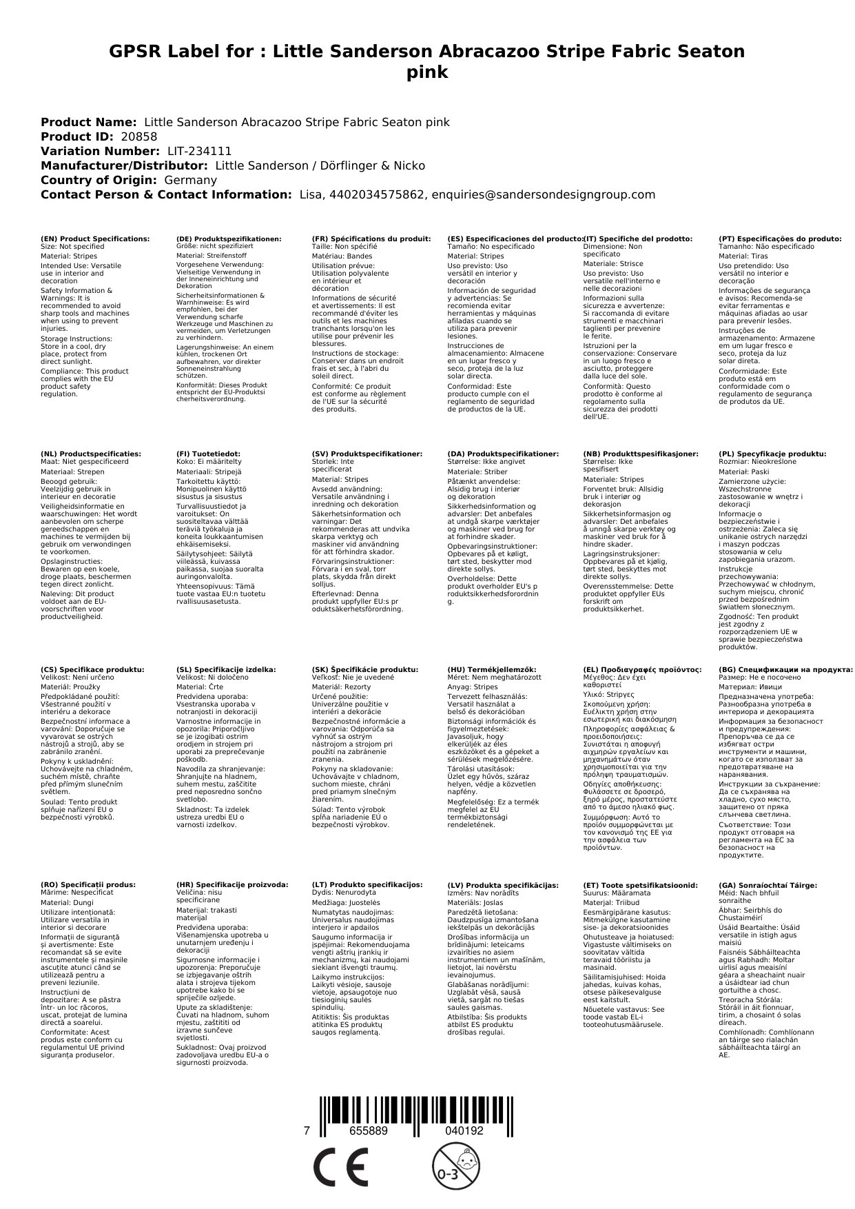 Stellen Sie eine Frage, um mehr über das Produkt zu erfahrenHier sehen Sie einen klassischen und schönen Streifenstoff von Little Sanderson aus der Kollektion Abracazoo.