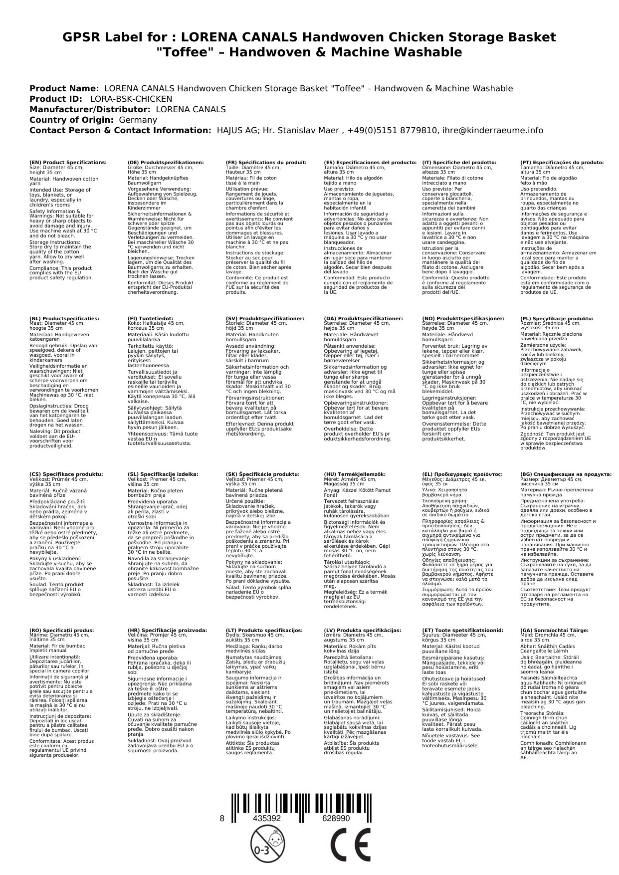 Unser Hühner-Aufbewahrungskorb bietet Ihnen eine durchdachte Kombination aus Design und Funktionalität für das Kinderzimmer. Mit seinem großzügigen Durchmesser von 45 cm und einer Höhe von 35 cm bietet er ausreichend Platz für verschiedenste Aufbewahrungsbedürfnisse. Das verwendete Material, handgeknüpftes Baumwollgarn, steht für Qualität und Nachhaltigkeit. Die Maschinenwaschbarkeit bei 30°C erleichtert Ihnen die Pflege erheblich, sodass der Korb stets hygienisch und einladend bleibt. Diese Eigenschaften machen ihn zu einer praktischen und dekorativen Ergänzung für jedes Kinderzimmer, egal ob für Spielzeug, Bettwäsche oder als stylischer Wäschekorb.
