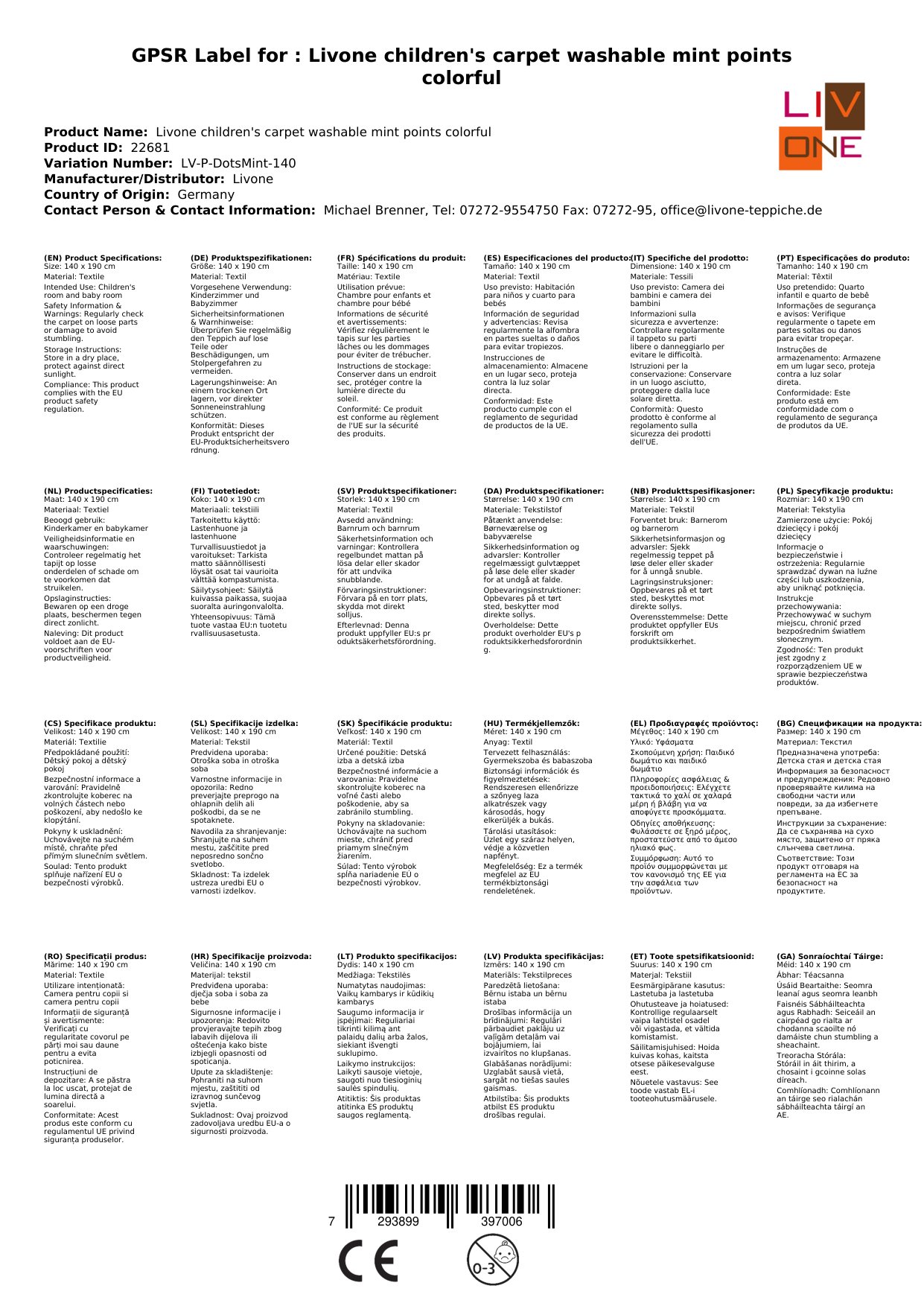 Livone Kinderteppich waschbar mint Punkte bunt, Teppichgrösse: 140 x 190 cm