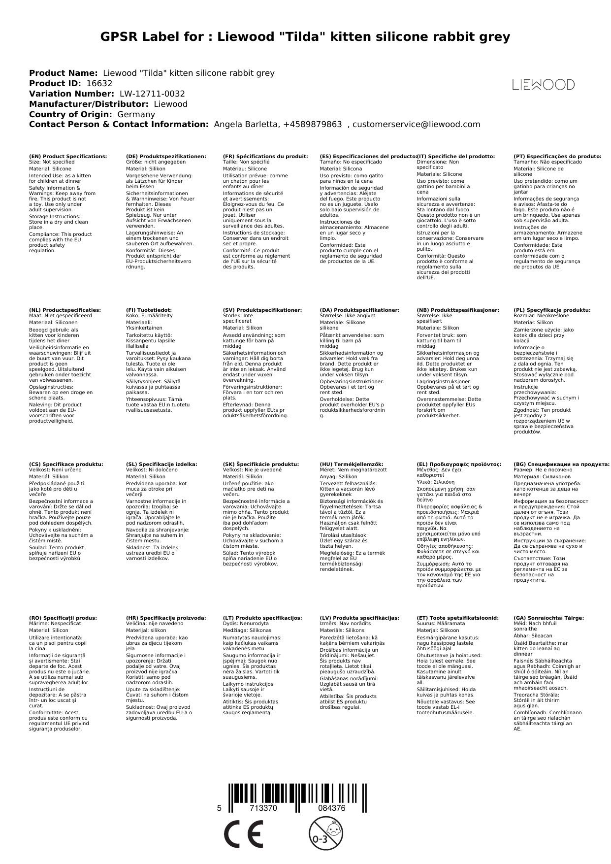 Liewood "Tilda" Lätzchen Silikon Hase grau