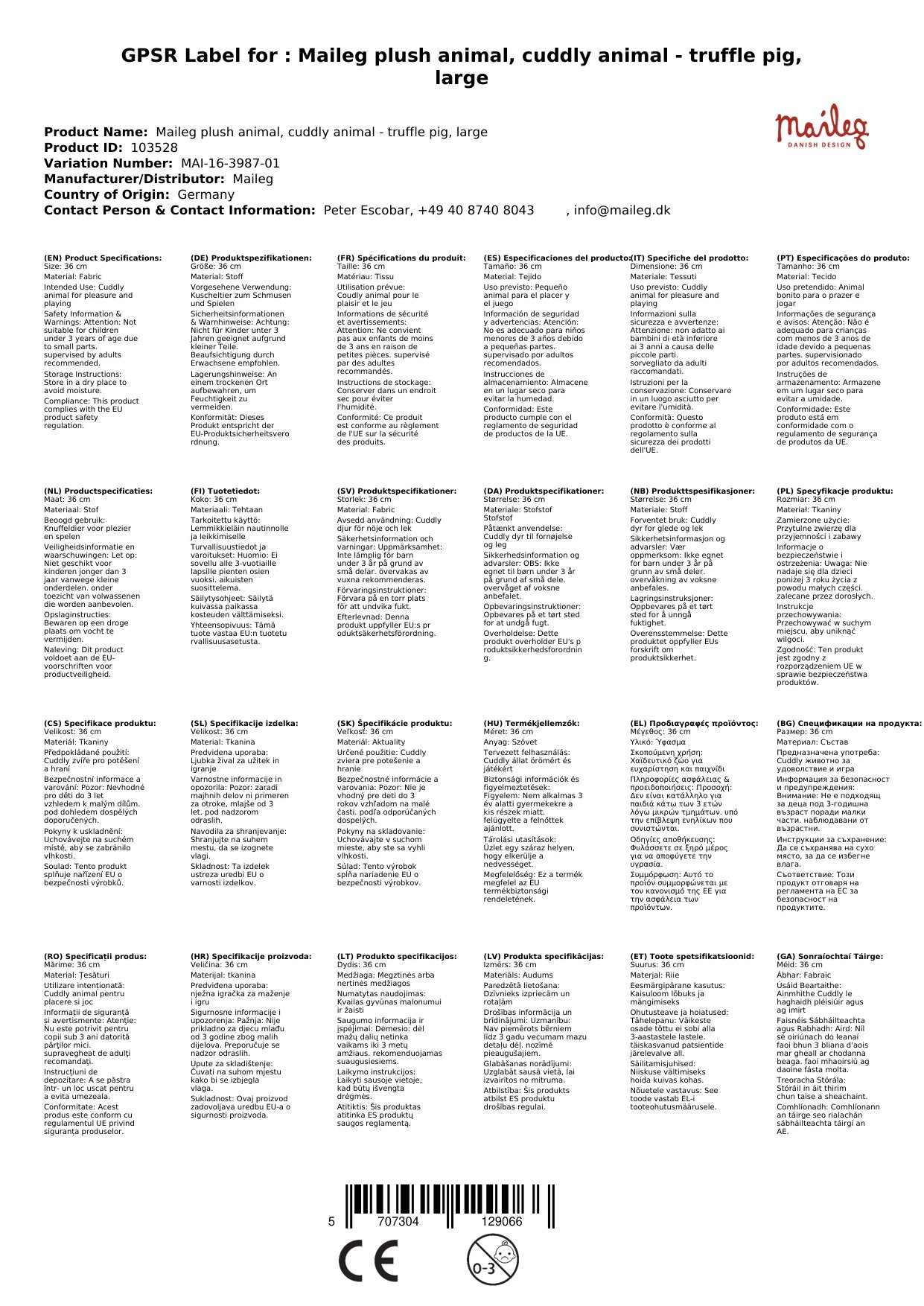 - Größe: Mit einer Höhe von 36cm und einem Bruttogewicht von 1.76kg ist das Maileg Trüffelschwein ein großes Kuscheltier, perfekt zum Schmusen und Spielen.