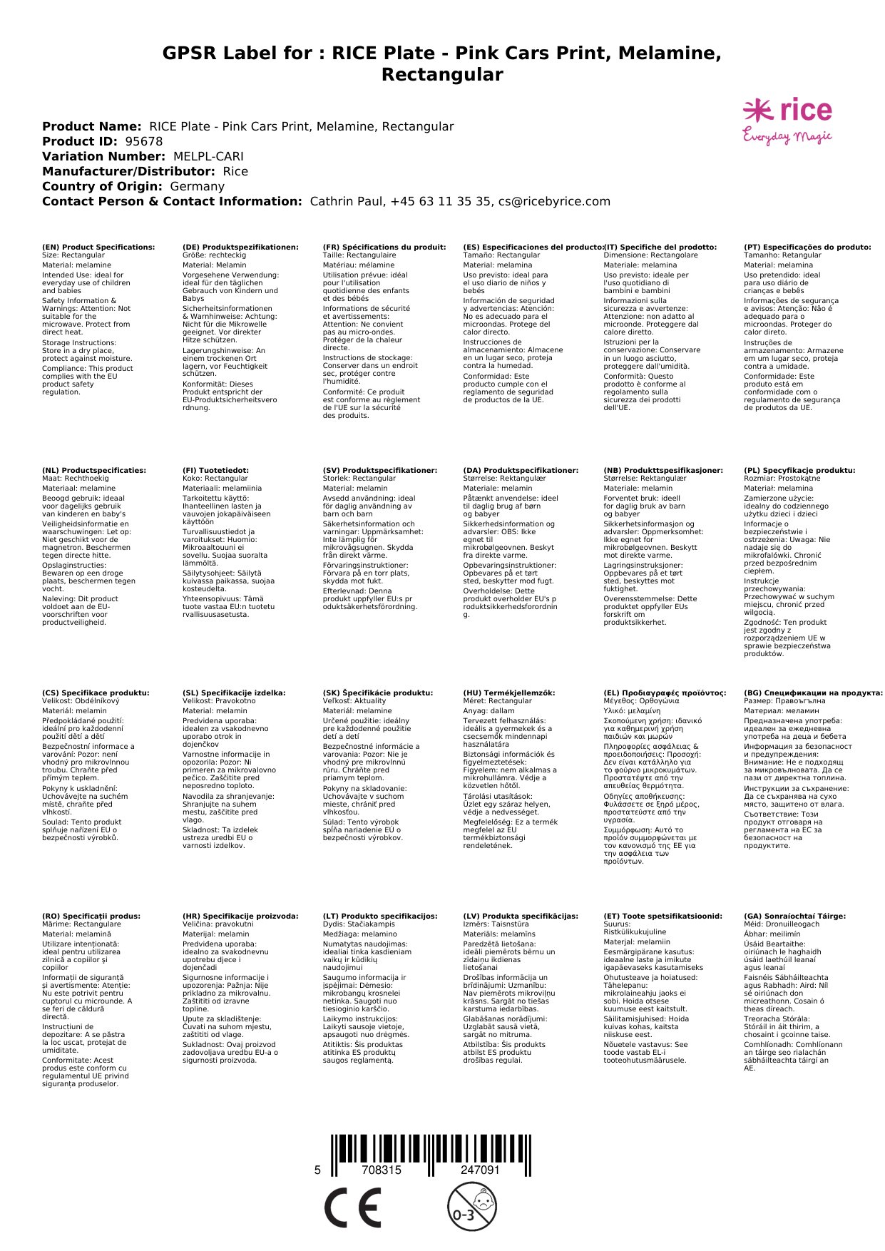 Stellen Sie eine Frage, um mehr über das Produkt zu erfahrenRICE Teller - Pink Cars Print, Melamin, rechteckig