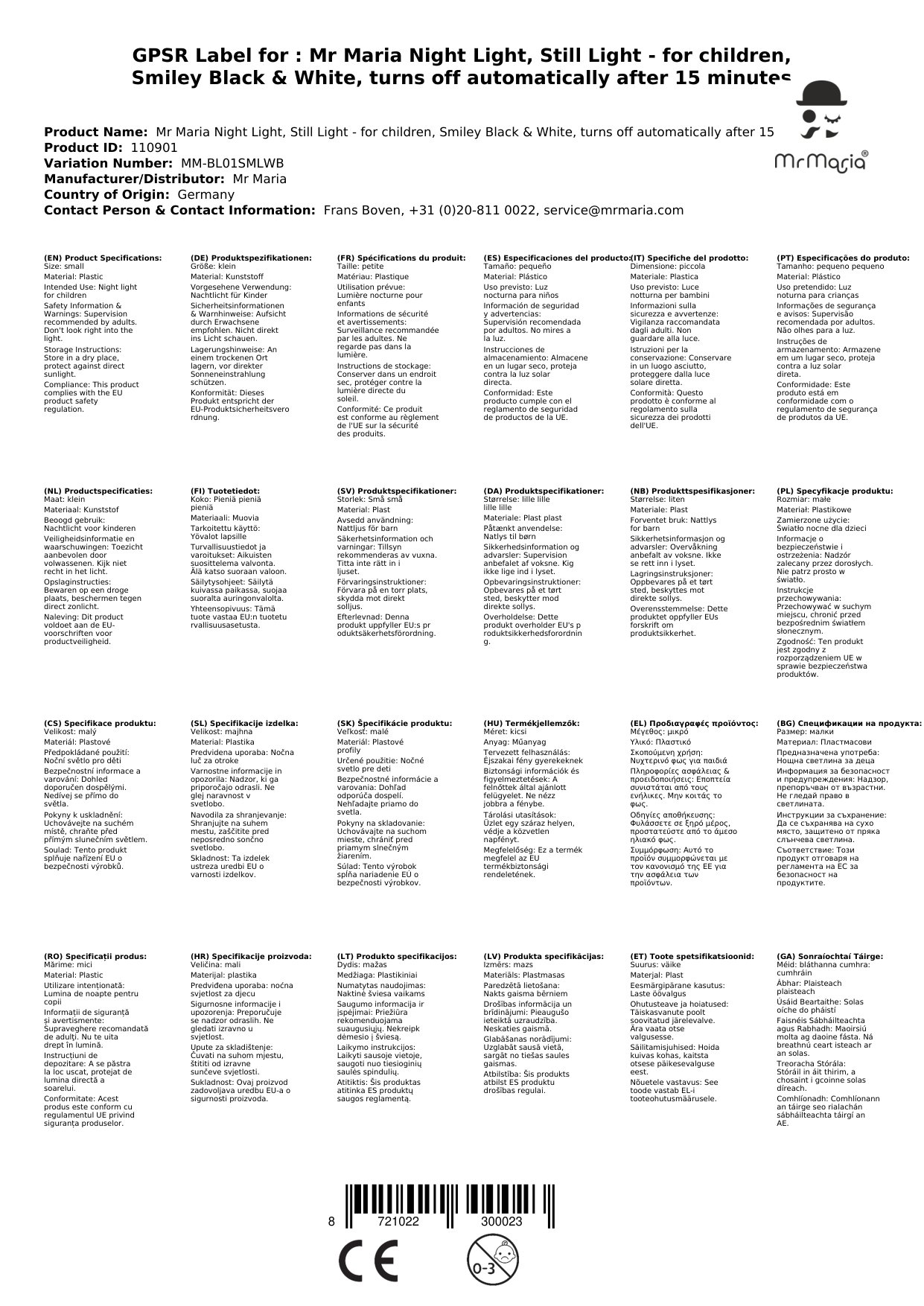 Das Mr Maria Nachtlicht ist ein niedlicher und praktischer Begleiter für Kinder und Erwachsene gleichermaßen. Die Lampe verfügt über eine automatische Abschaltung, die nach 15 Minuten aktiv wird, um Energie zu sparen.