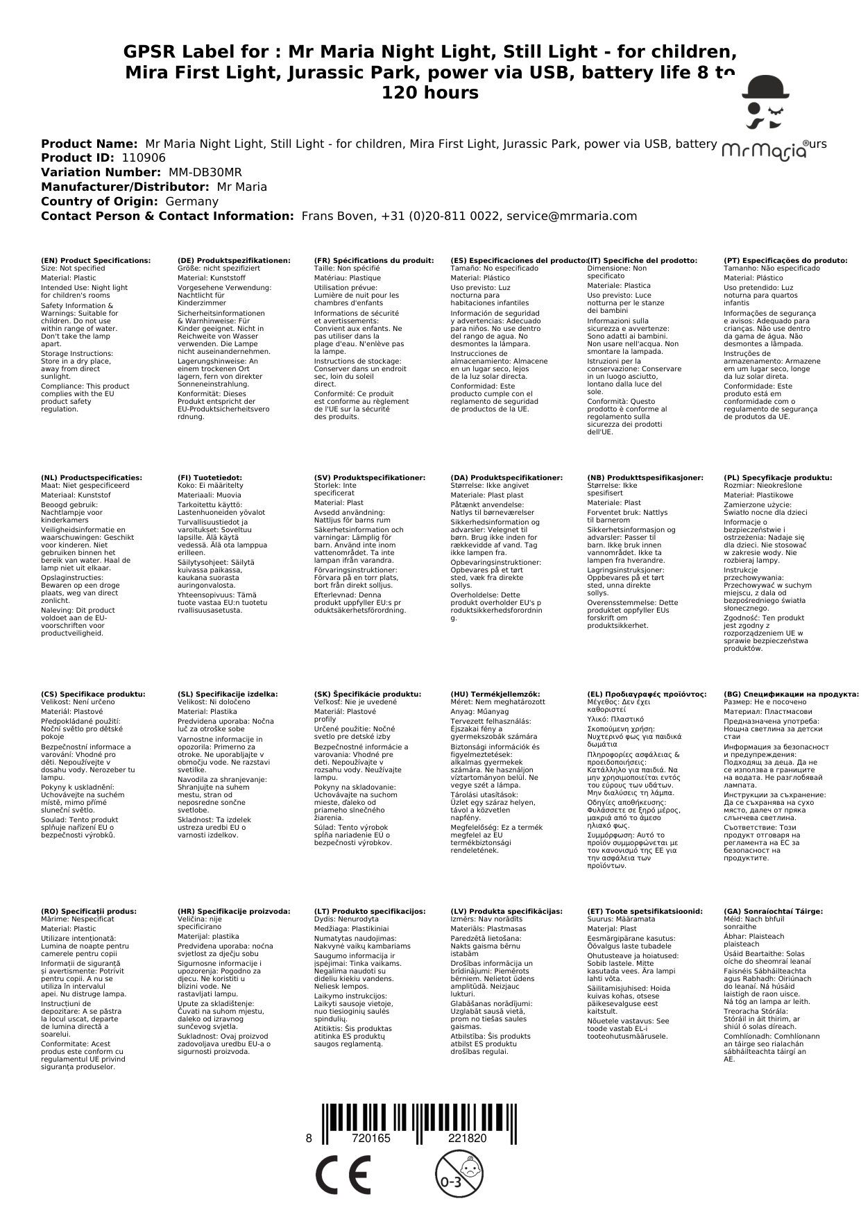 Stellen Sie eine Frage, um mehr über das Produkt zu erfahrenMr Maria Nachtlicht, Stilllicht - für Kinder, Mira First Light, Jurassic Park, Stromversorgung über USB, Akkulaufzeit 8 bis 120 Stunden
