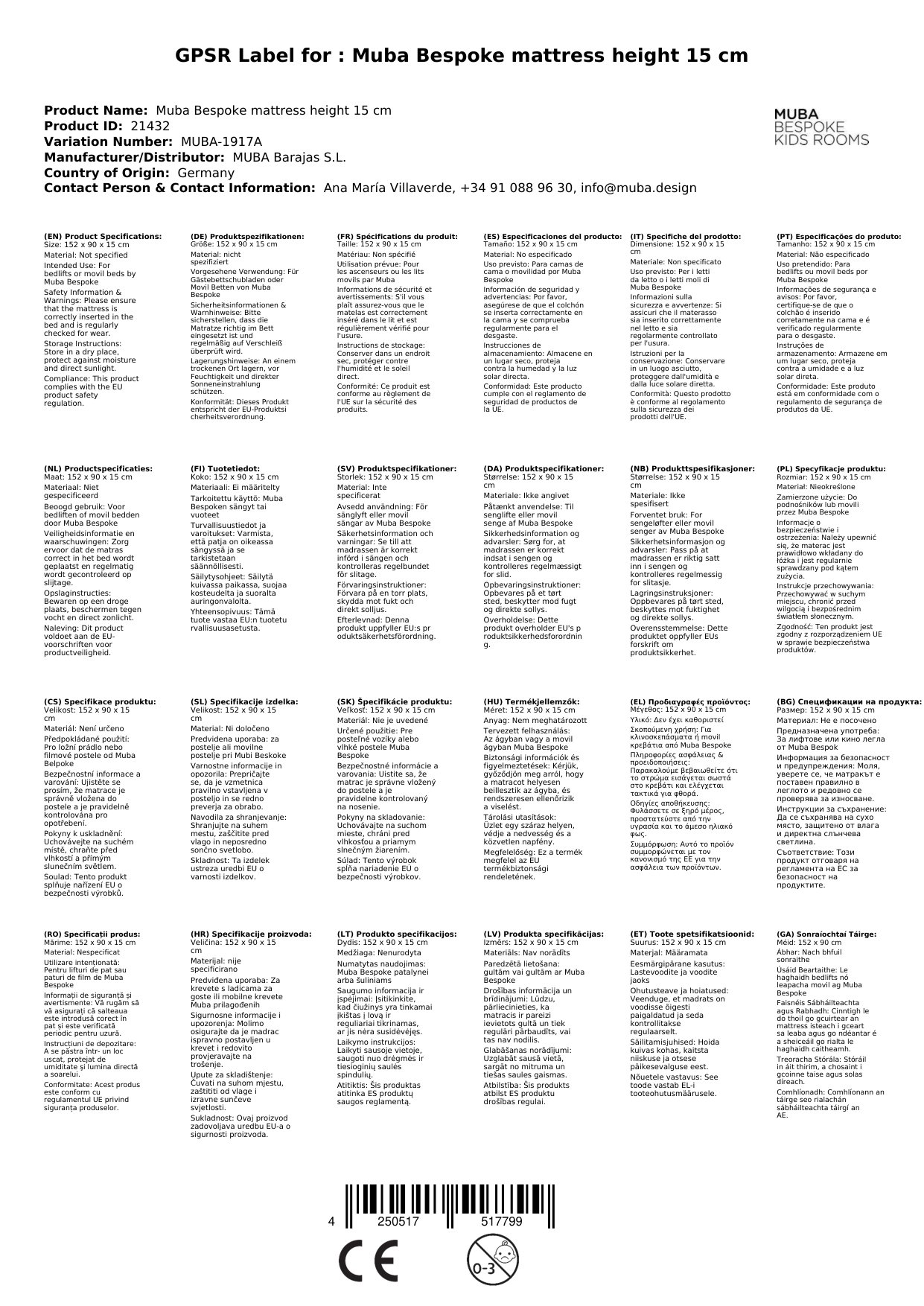 Stellen Sie eine Frage, um mehr über das Produkt zu erfahrenDie Matratze passt in alle Muba Bespoke Betten und sorgt für einen wohligen Schlafkomfort Ihres Kindes. Sie verzichtet auf die bei Erwachsenen üblichen Schlafzonen. Ihr Kind liegt überall sicher und bequem und erhält zudem eine gute Unterstützung für den ganzen Körper. Da Kinder eher selten an der Stelle schlafen, an der sie ursprünglich hingelegt wurden, sind Zonen völlig überflüssig. Die Matratze hat eine Höhe von 15 cm und ist in verschiedenen Breiten und Längen auswählbar. Natürlich können Sie sie auch für andere passende Bettmodelle fremder Hersteller verwenden.