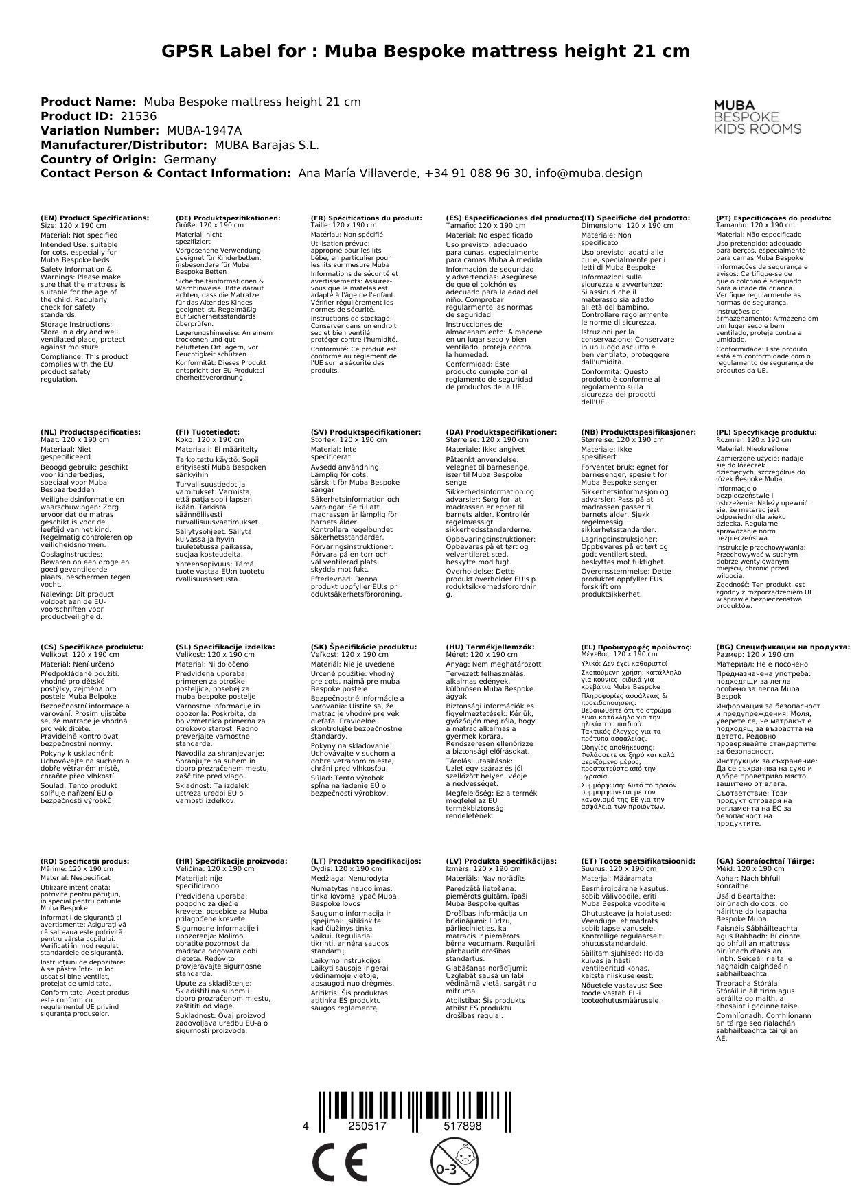 Stellen Sie eine Frage, um mehr über das Produkt zu erfahrenDie Matratze passt in alle Muba Bespoke Betten und sorgt für einen wohligen Schlafkomfort Ihres Kindes. Sie verzichtet auf die bei Erwachsenen üblichen Schlafzonen. Ihr Kind liegt überall sicher und bequem und erhält zudem eine gute Unterstützung für den ganzen Körper. Da Kinder eher selten an der Stelle schlafen, an der sie ursprünglich hingelegt wurden, sind Zonen völlig überflüssig. Die Matratze hat eine Höhe von 21 cm und ist in verschiedenen Breiten und Längen auswählbar.