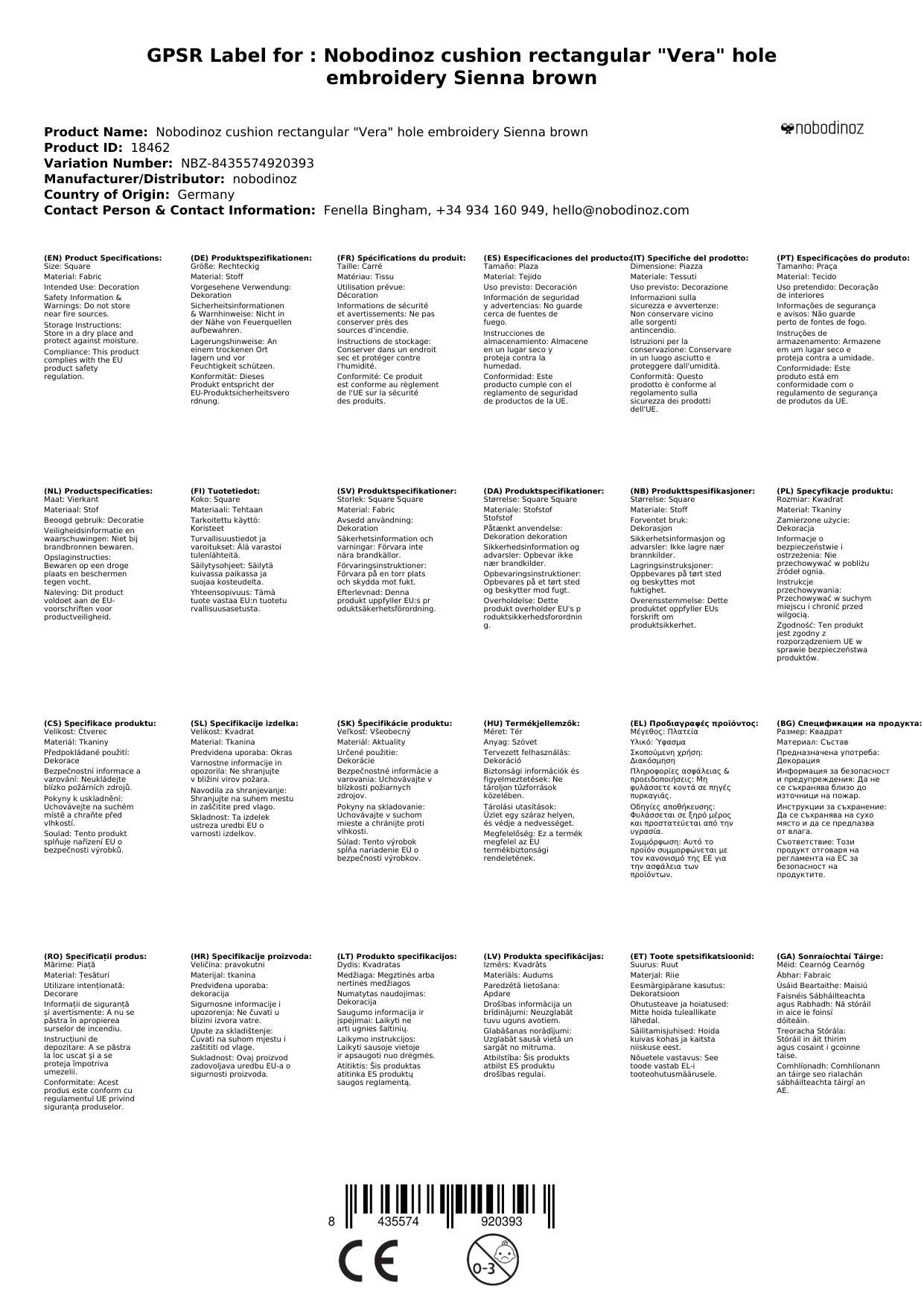 Das Kissen ist Bestandteil der Designlinie 'Vera'. Bei dieser Designlinie werden wunderschön ausgewählte Farben der Natur mit zarten Stoffen und auch Elementen in typisch spanischer Lochstickerei kombiniert. Das macht die Serie so wundervoll und einzigartig. Die Farben lindgrün, schiefergrau, sienna braun und natural sind die Stars der Serie. Sie können aufs Schönste duftigen Voile mit Lochstickerei mit grobem Canvas und plastisch gequilteten Artikeln kombinieren und erzeugen so spannende Kontraste in Ihrem Baby- und Kinderzimmer. Die verwendeten Stoffe bestehen alle aus Bio-Baumwolle und entsprechen selbstverständlich - wie natürlich auch bei allen anderen Serien von Nobodinoz - dem Öko Tex Standard Klasse 1. Uns begeistert, dass die Stoffe in Barcelona gefärbt, bedruckt und auch verarbeitet werden.