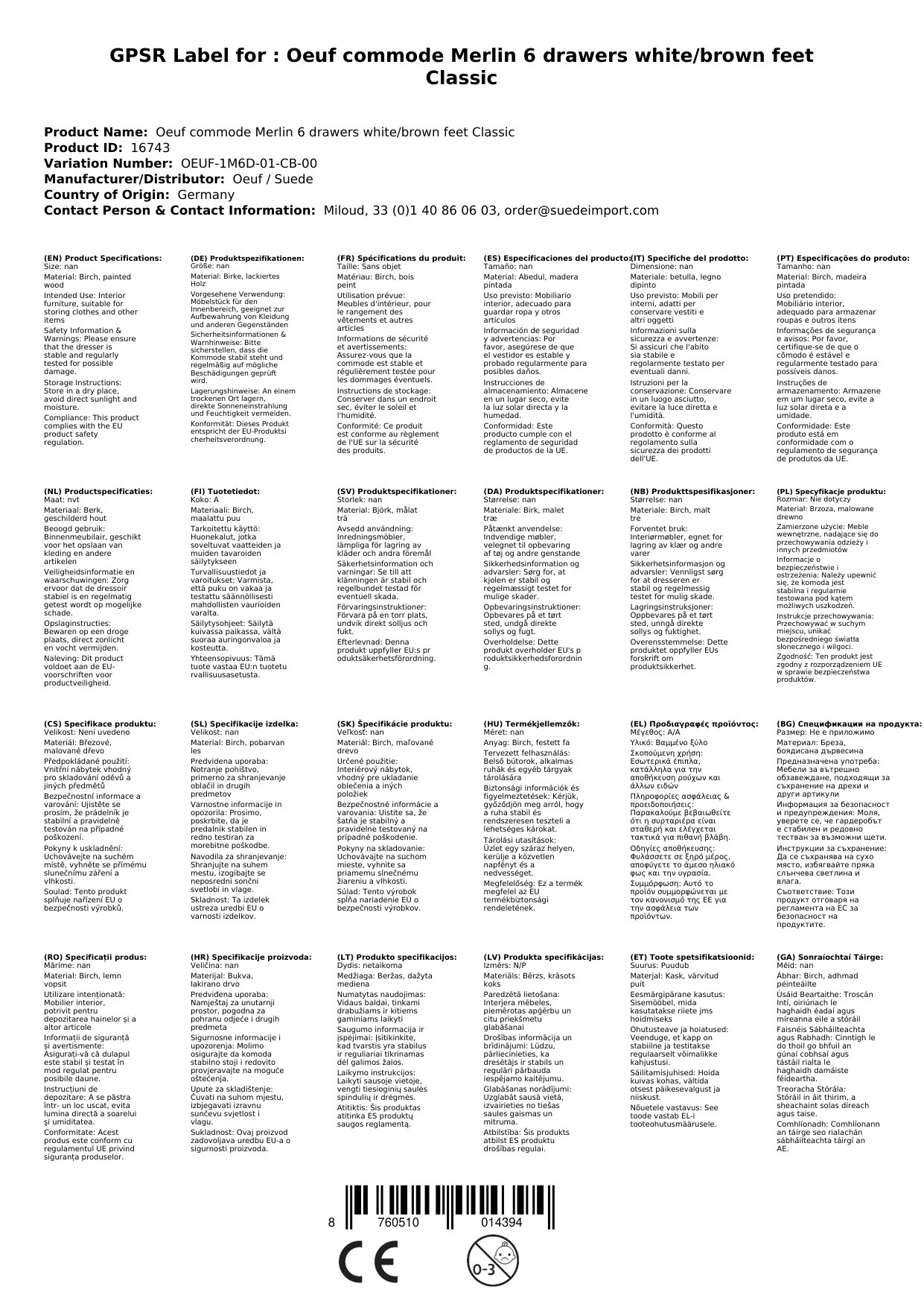 Oeuf Kommode Merlin 6 Schubkästen weiß/Birke Füße Classic