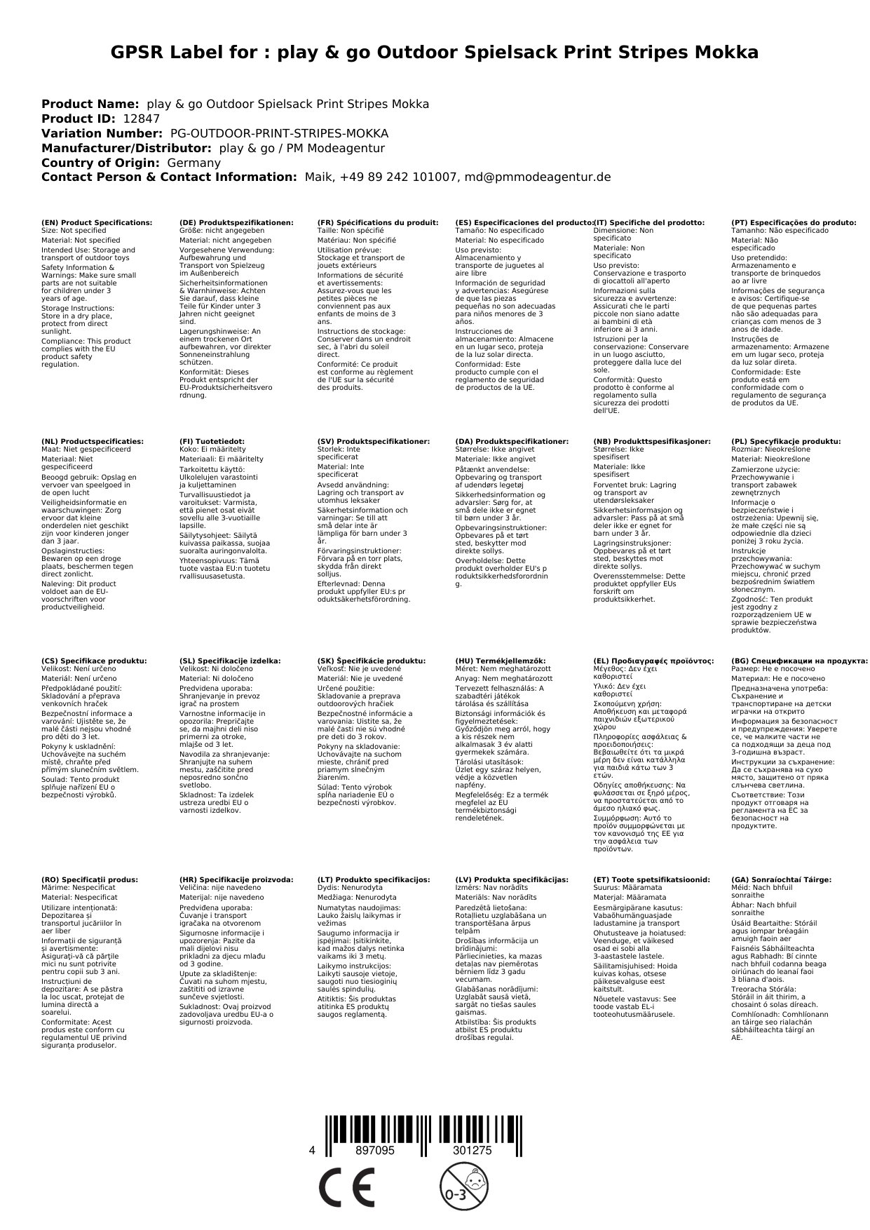 play & go Outdoor Spielsack Print Streifen Mokka