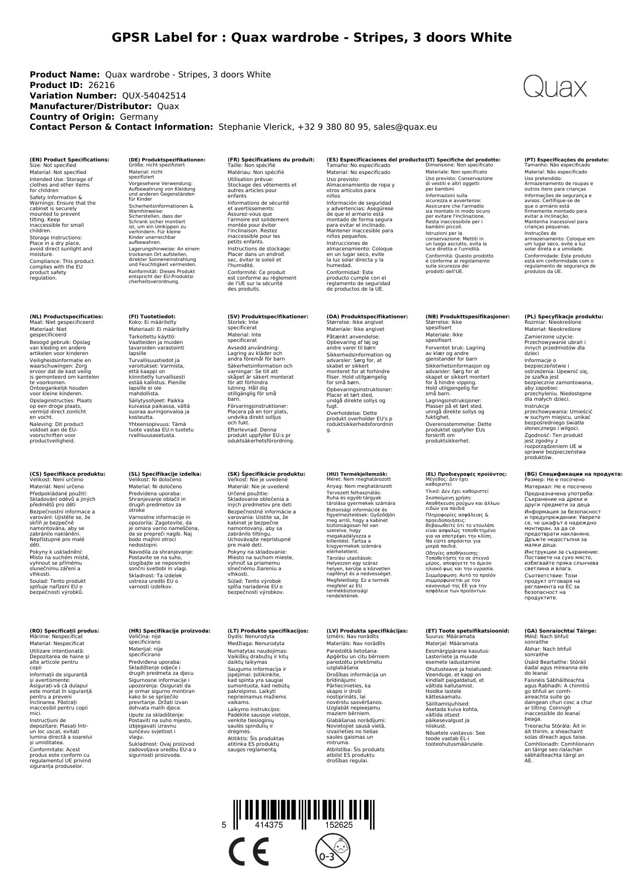 Stellen Sie eine Frage, um mehr über das Produkt zu erfahrenQuax Kleiderschrank - Stripes, 3 Türen Weiß