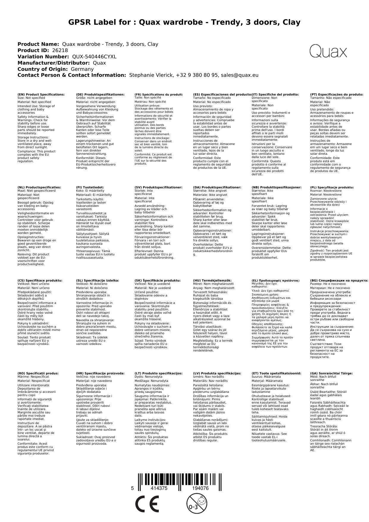 Kontrolle: Überprüfen Sie die Kleiderschrank regelmäßig angesichts zerbrochener, verzerrter oder verschwundener Teile. Bei Feststellung solcher Mängel sofort den Gebrauch des Möbels unterbrechen.