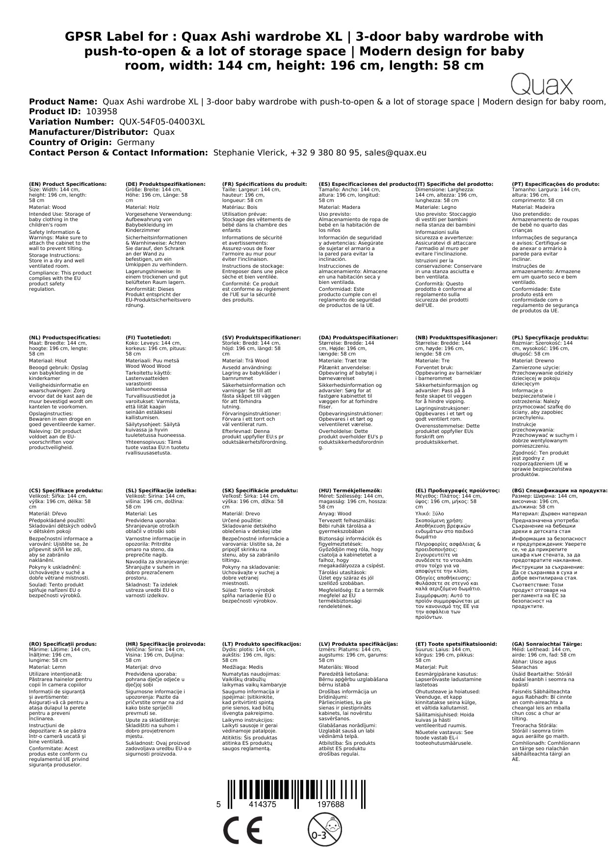 Stellen Sie eine Frage, um mehr über das Produkt zu erfahrenQuax Ashi Kleiderschrank XL | 3-türiger Babykleiderschrank mit Push-to-Open & viel Stauraum | Modernes Design für Babyzimmer, Breite: 144 cm, Höhe: 196 cm, Länge: 58 cm