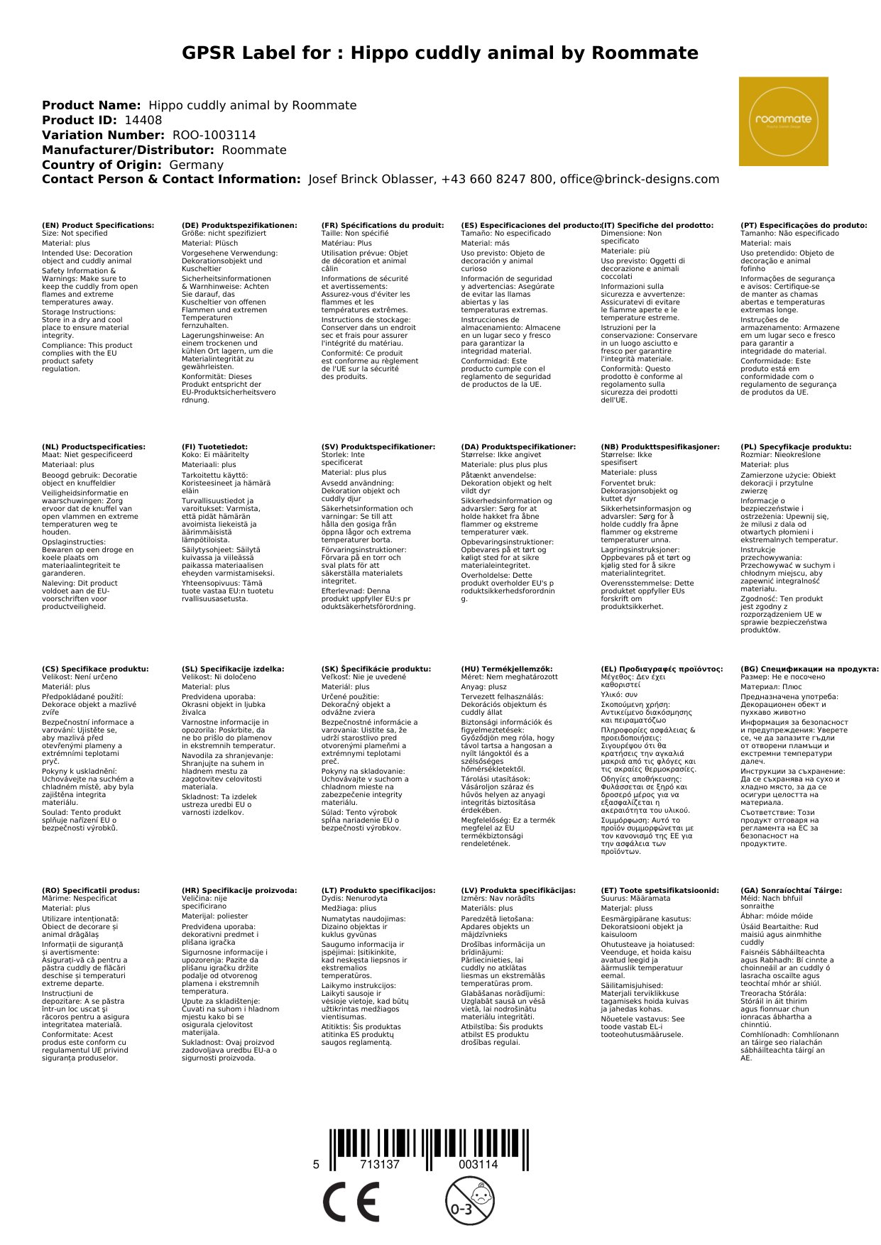 Stellen Sie eine Frage, um mehr über das Produkt zu erfahrenHier zeigen wir Ihnen ein zauberhaftes Nilpferd Kuscheltier von Roommate.