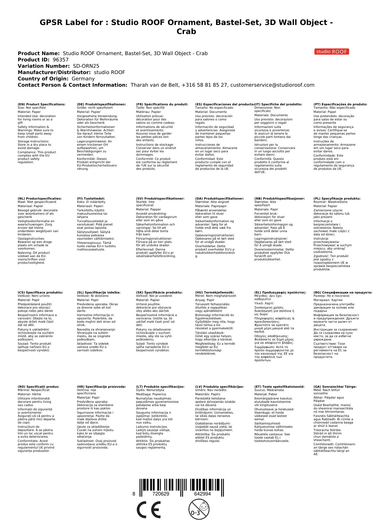 Stellen Sie eine Frage, um mehr über das Produkt zu erfahrenStudio ROOF Ornament, Bastel-Set, 3D Wandobjekt - Krabbe