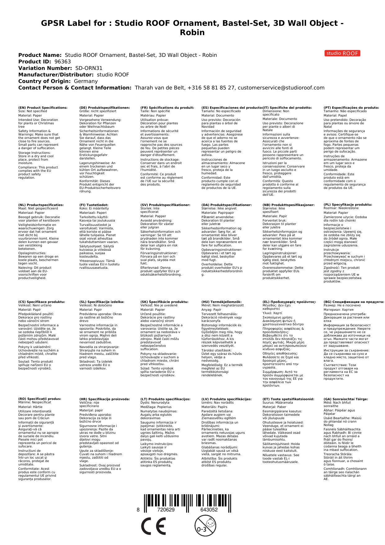 Stellen Sie eine Frage, um mehr über das Produkt zu erfahrenStudio ROOF Ornament, Bastel-Set, 3D Wandobjekt - Robin