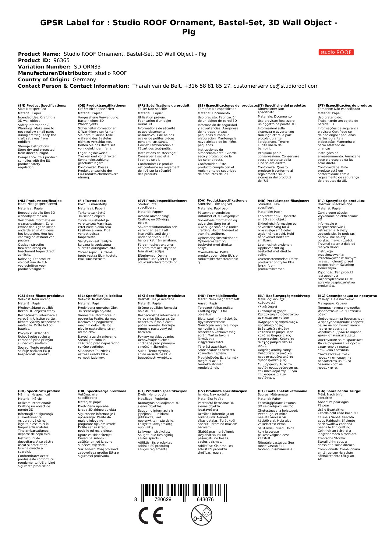 Stellen Sie eine Frage, um mehr über das Produkt zu erfahrenStudio ROOF Ornament, Bastel-Set, 3D Wandobjekt - Schwein