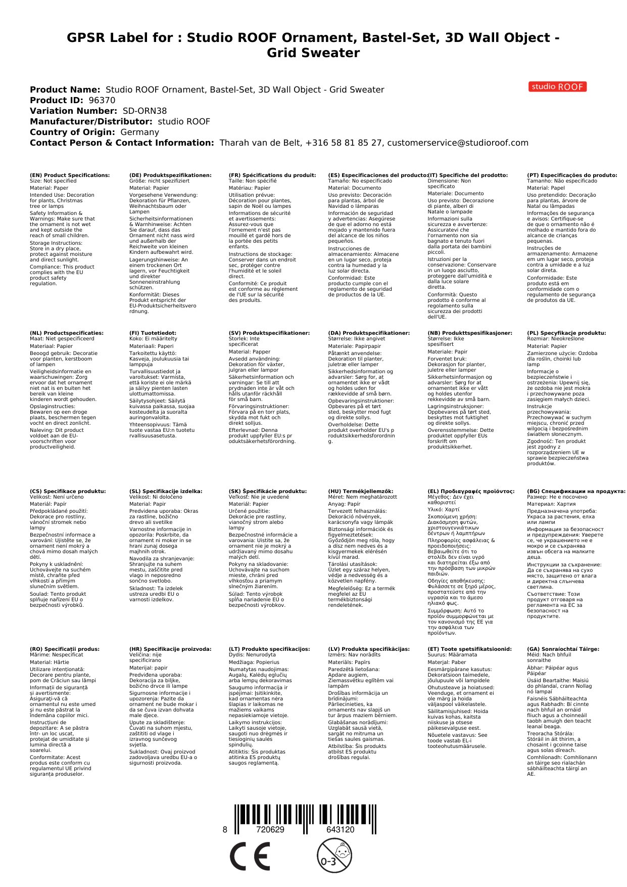 Machen Sie jemandem eine Freude oder gönnen Sie sich selbst etwas Besonderes mit dem Studio ROOF Ornament Bastel-Set. Bestellen Sie es noch heute und freuen Sie sich auf viele glückliche Momente!