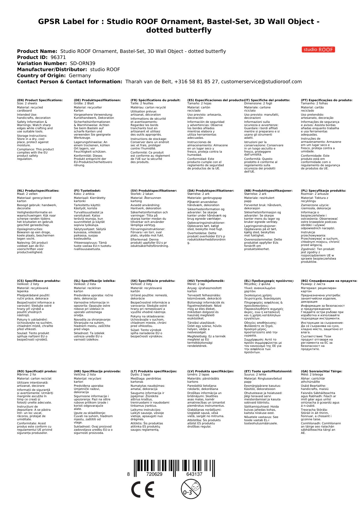 Erstellen Sie mit diesem Studio ROOF Ornament in Form eines gepunkteten Schmetterlings Ihr eigenes kleines Kunstwerk! Das Bastel-Set besteht aus 2 Blatt recyceltem Karton, die mit pflanzlichen Tinten bedruckt sind, und hat 8 Teile zum Herausnehmen und Zusammenbauen.