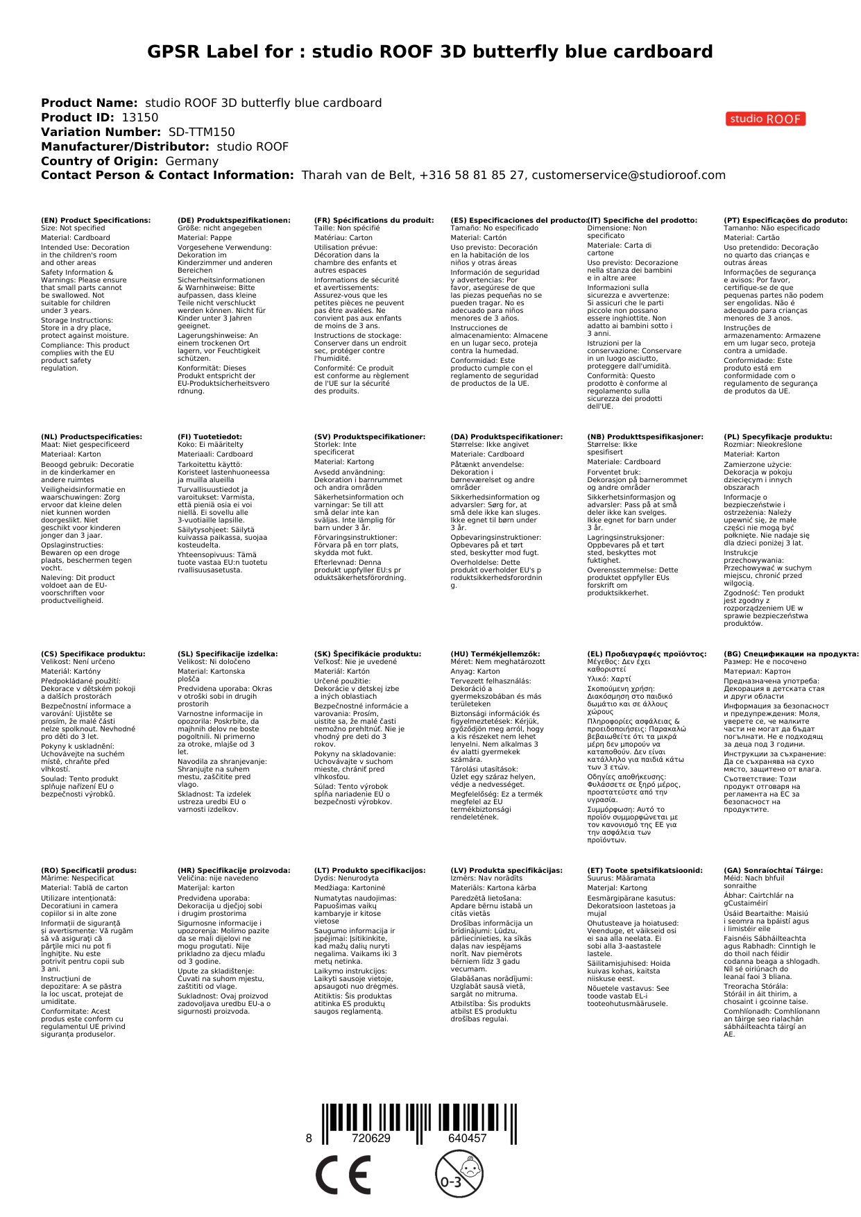 Das 3D Objekt kommt aus dem Hause studio ROOF. Das niederländische Label hat sich auf Dekoration und Spielzeug aus Pappe spezialisiert und besticht durch originelle und phantasievolle Figuren.