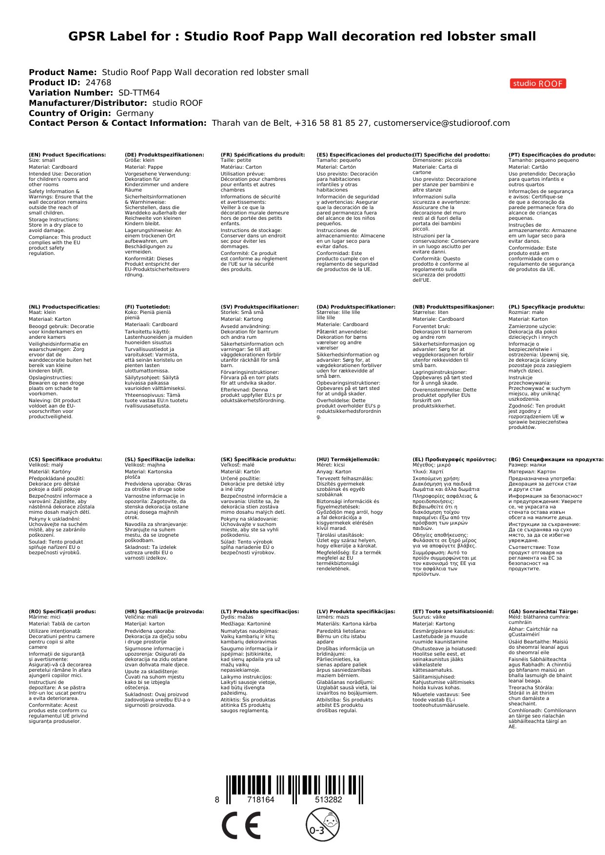 Das 3D Objekt kommt aus dem Hause studio ROOF. Das niederländische Label hat sich auf Dekoration und Spielzeug aus Pappe spezialisiert und besticht durch originelle und phantasievolle Figuren.