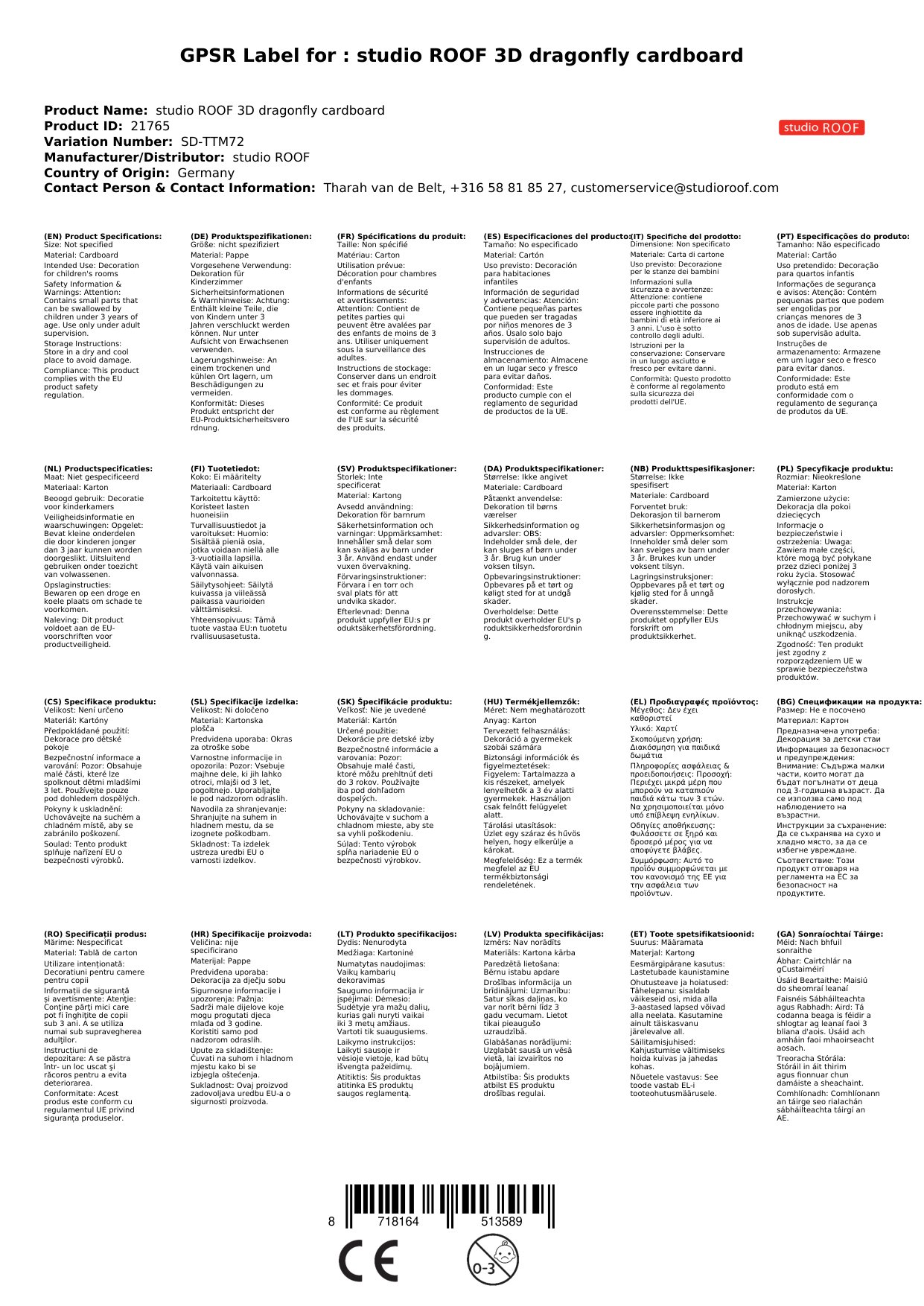Das 3D Objekt kommt aus dem Hause studio ROOF. Das niederländische Label hat sich auf Dekoration und Spielzeug aus Pappe spezialisiert und besticht durch originelle und phantasievolle Figuren.