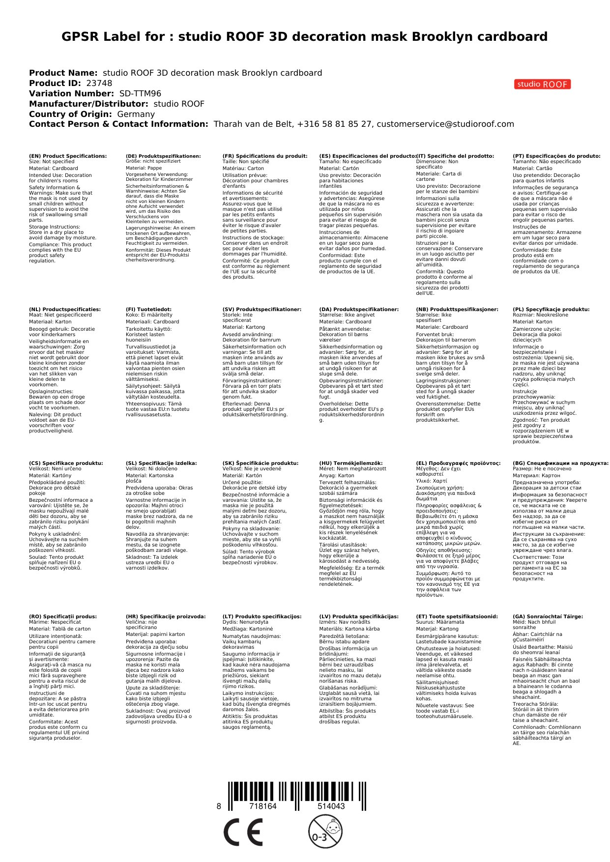 Das 3D Objekt kommt aus dem Hause studio ROOF. Das niederländische Label hat sich auf Dekoration und Spielzeug aus Pappe spezialisiert und besticht durch originelle und phantasievolle Figuren.