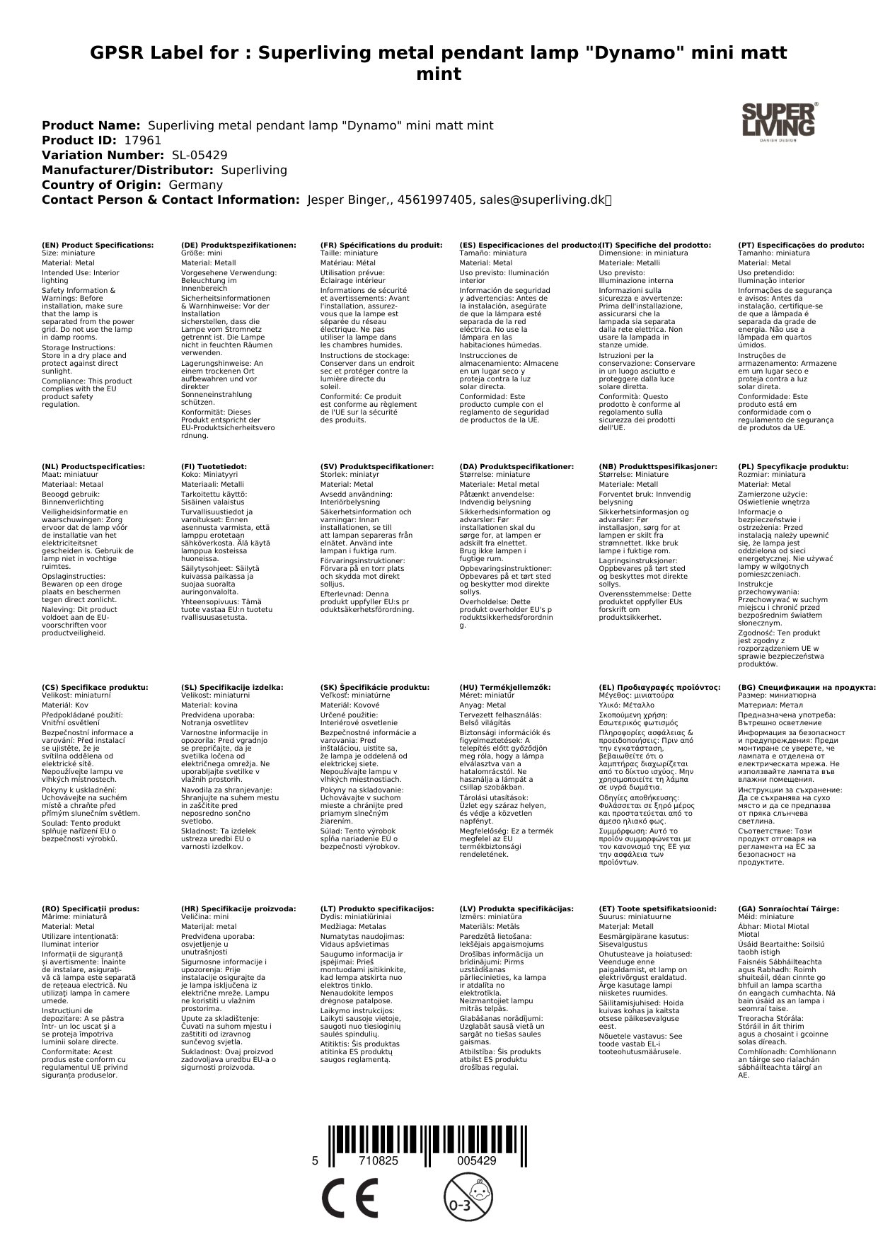 Superliving Metall Pendellampe "Dynamo" mini matt mint