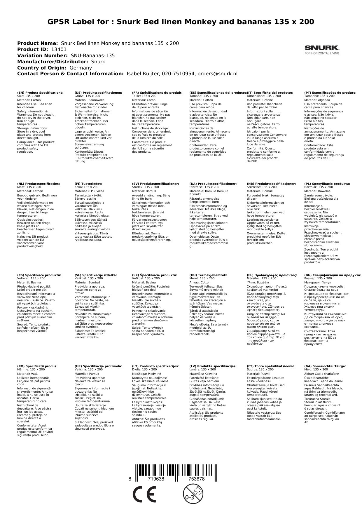 Snurk Bettwäsche Affe und Bananen 135 x 200