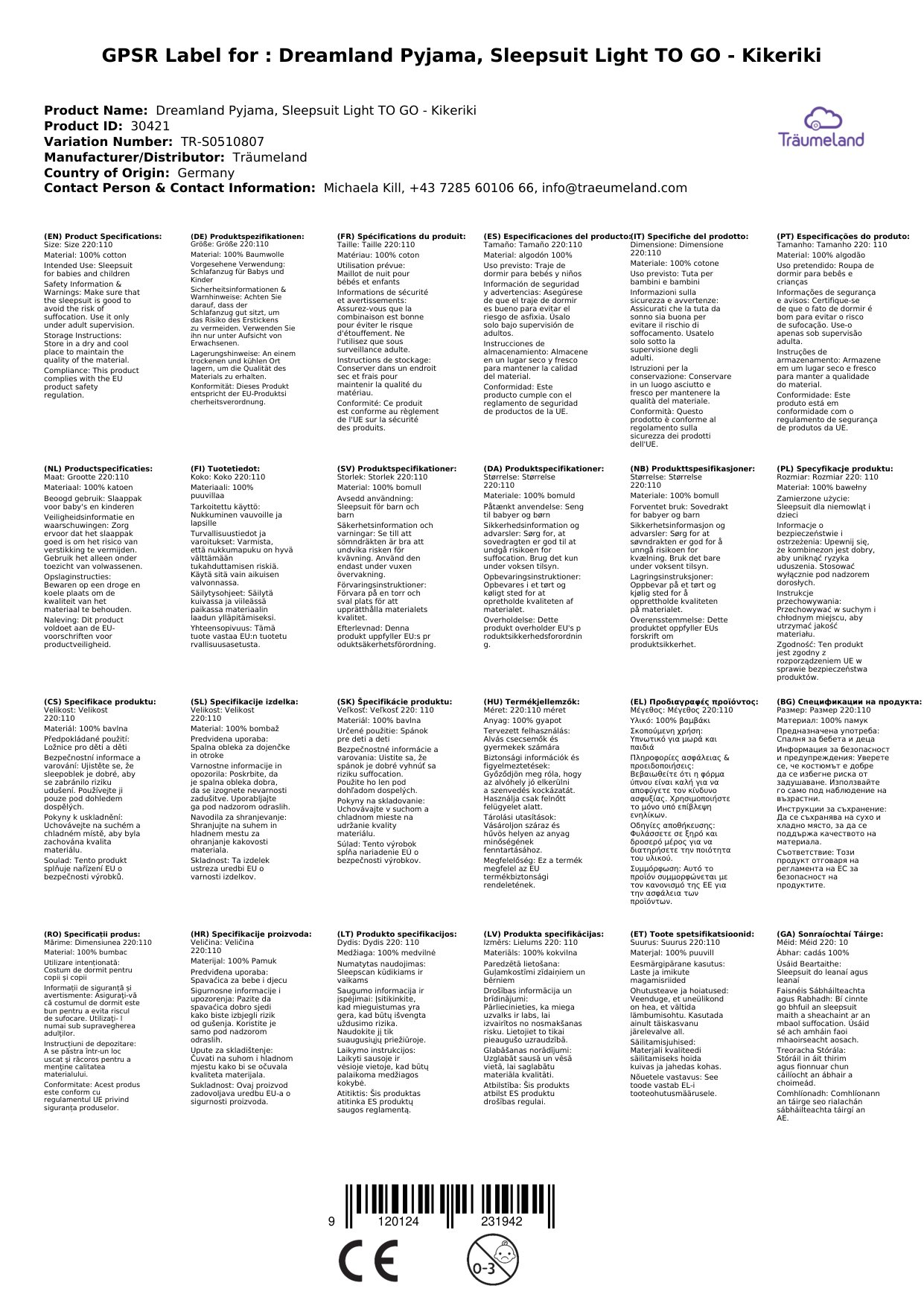 Der Träumeland Pyjama, Kinderpyjama, Schlafanzug Light TO GO - Kikeriki bietet Ihrem Baby oder Kind die perfekte Kombination aus Sicherheit und Komfort. Der luftige und leichte Stoff ermöglicht Ihrem Kind eine freie Bewegung und verhindert ein Überhitzen. Der Reißverschluss in der Mitte des Schlafanzuges erleichtert das An- und Ausziehen und gewährleistet einen sicheren und festen Sitz.