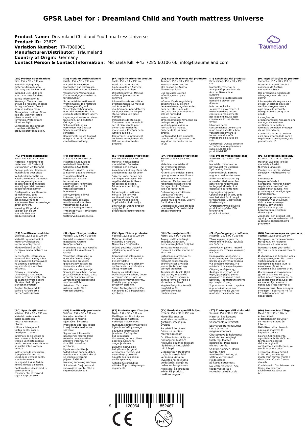 Die Kinder- und Jugendmatratze ist in verschiedenen Größen erhältlich. Die gewünschte Größe können Sie beim Bestellvorgang als Variante auswählen. Alle Produkte von Träumeland auf einen Blick erhalten Sie, wenn Sie auf den Herstelllerlink klicken.