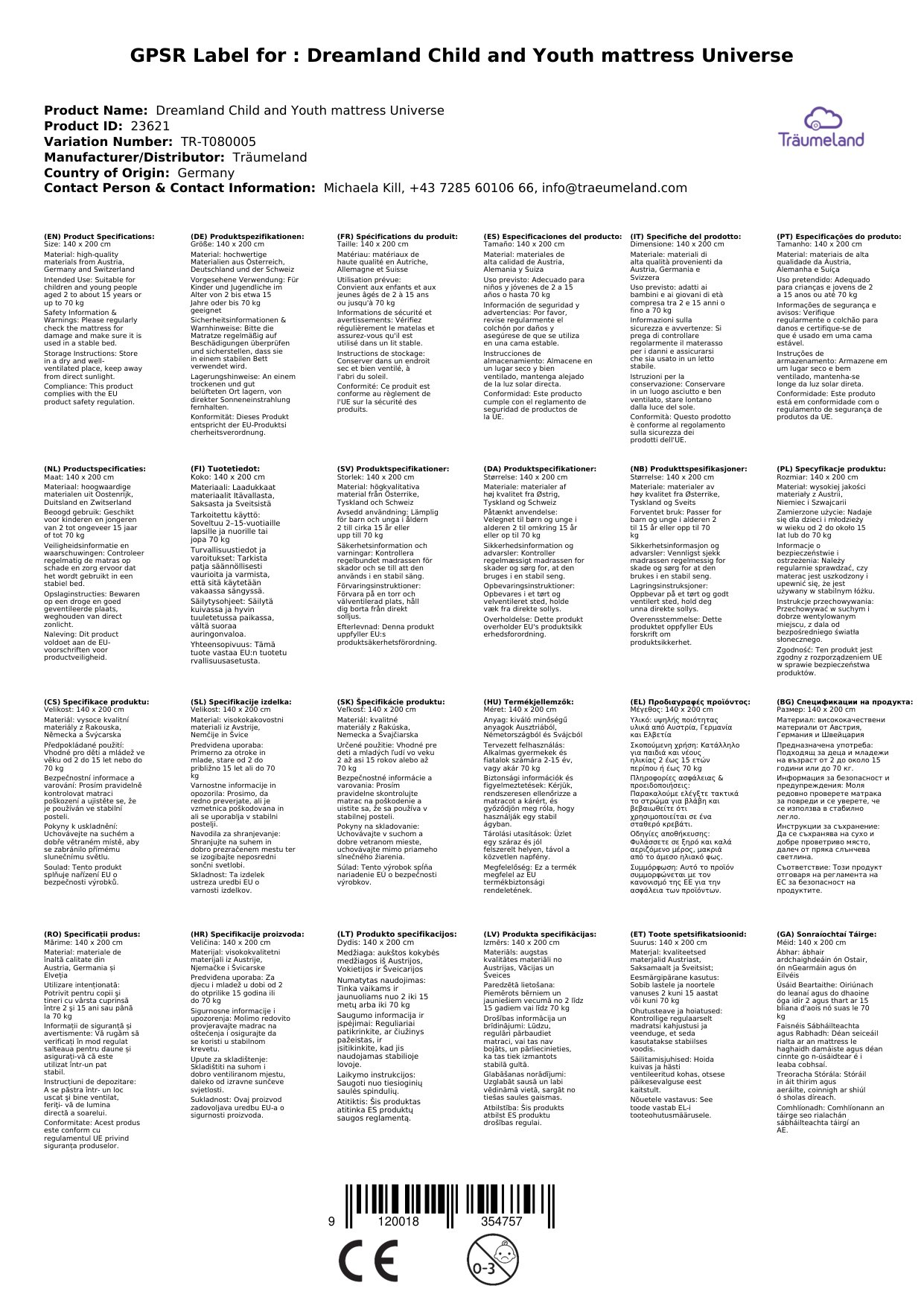 Die Kinder- und Jugendmatratze ist in verschiedenen Größen erhältlich. Die gewünschte Größe können Sie beim Bestellvorgang als Variante auswählen. Alle Produkte von Träumeland auf einen Blick erhalten Sie, wenn Sie auf den Herstelllerlink klicken.