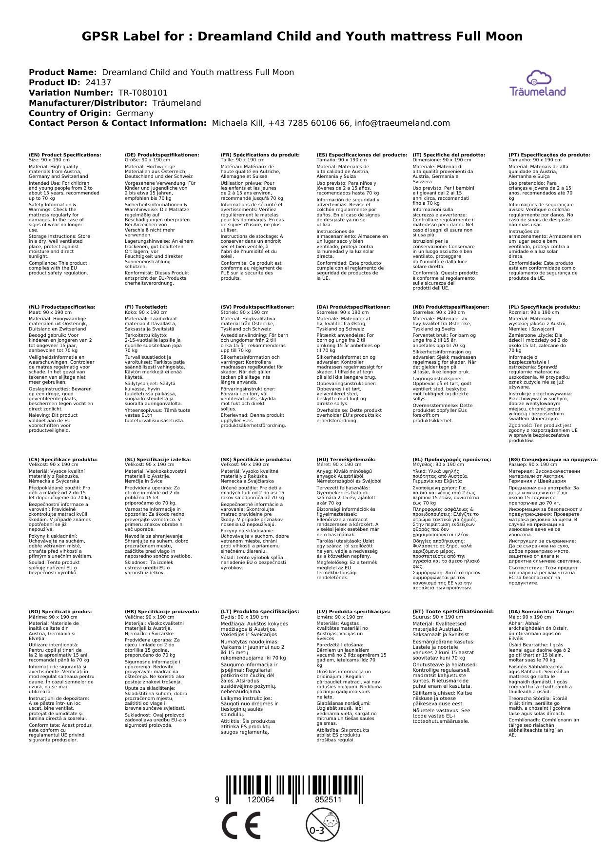 Die Kinder- und Jugendmatratze ist in verschiedenen Größen erhältlich. Die gewünschte Größe können Sie beim Bestellvorgang als Variante auswählen. Alle Produkte von Träumeland auf einen Blick erhalten Sie, wenn Sie auf den Herstelllerlink klicken.