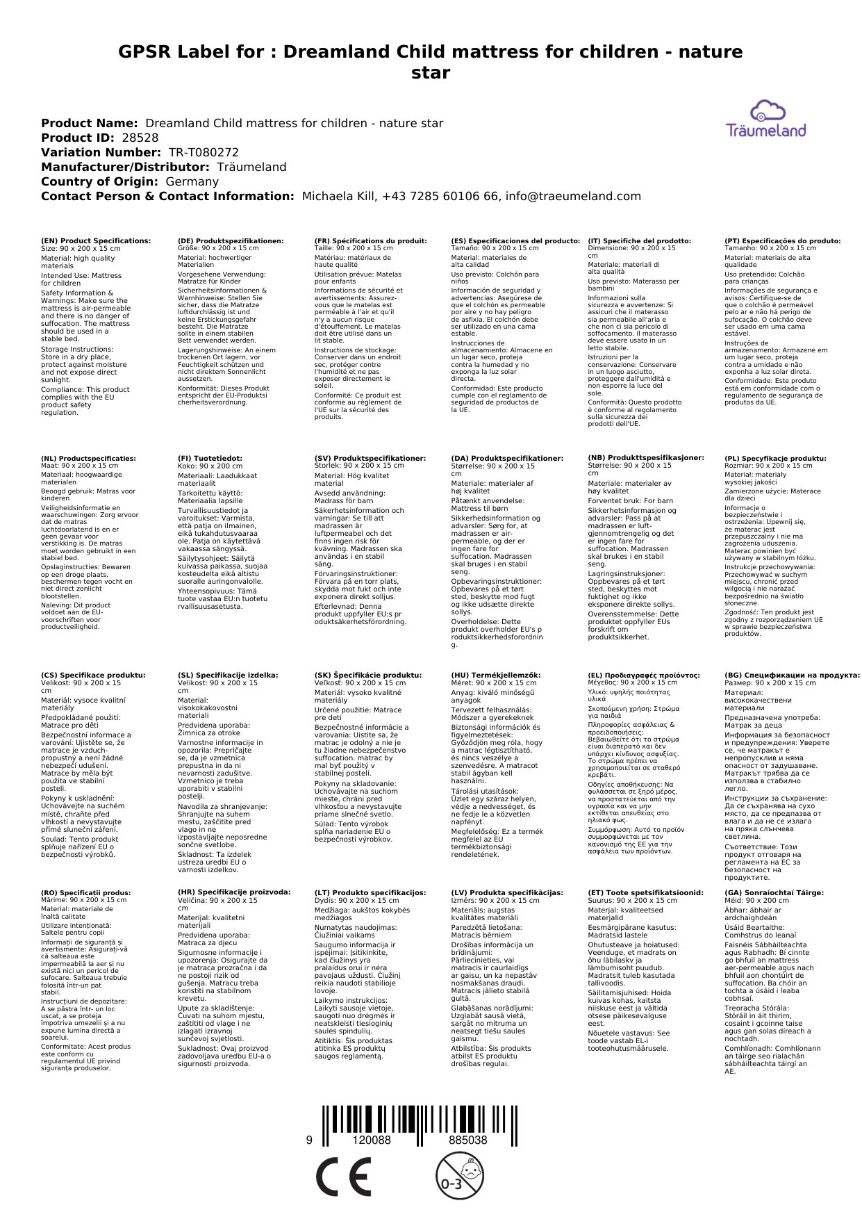 Die Kindermatratze Naturstern ist in den Größen 60 x 120 cm und 70 x 140 cm erhältlich und eignet sich somit für alle gängigen Babybetten.