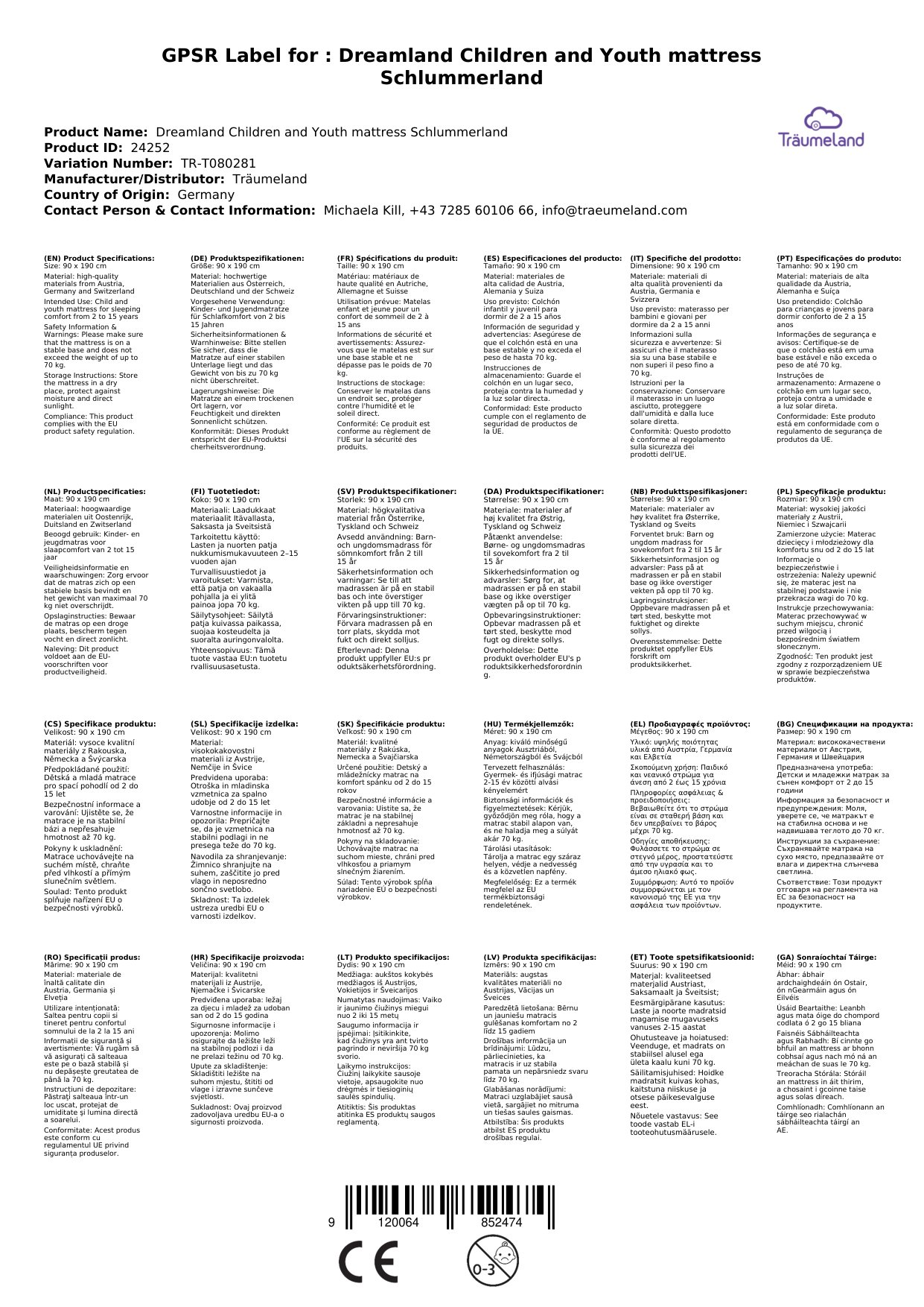 Die Kinder- und Jugendmatratze ist in verschiedenen Größen erhältlich. Die gewünschte Größe können Sie beim Bestellvorgang als Variante auswählen. Alle Produkte von Träumeland auf einen Blick erhalten Sie, wenn Sie auf den Herstelllerlink klicken.