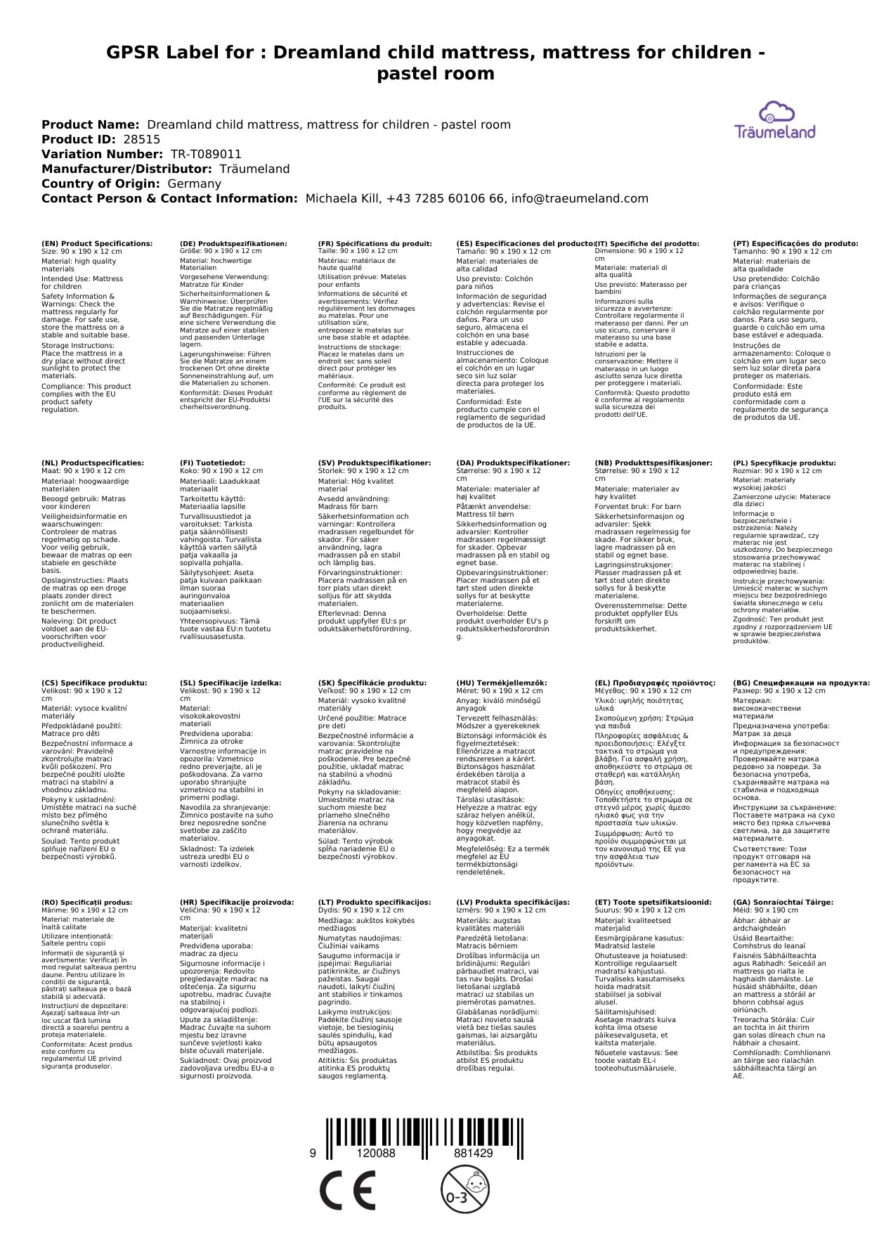 Träumeland Kindermatratze, Matratze für Kinder - Pastelltraum, Größe: 90 x 190 x 12 cm