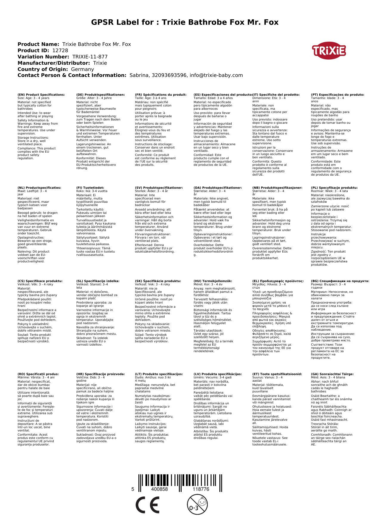 Trixie Bademantel Fuchs Mr. Fox, Alter: 3 - 4 Jahre